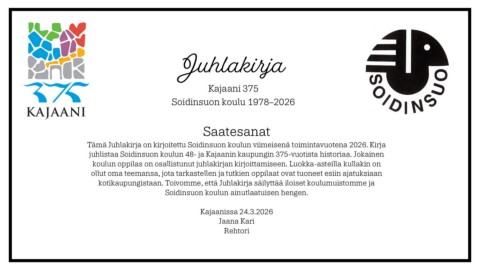 Tämä Juhlakirja on kirjoitettu Soidinsuon koulun viimeisenä toimintavuotena 2026. Kirja