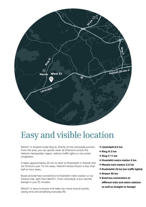 West51 is located inside Ring III, directly at the Länsiväylä junction. Länsiväylä 0,5 km