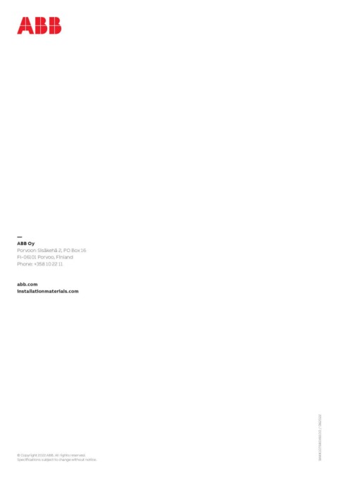 — 9AKK107680A9100 / 082022 ABB Oy Porvoon Sisäkehä 2, PO Box 16 FI-06101 Porvoo, Finland Phone: +358 10 22 11 abb.com installationmaterials.com © Copyright 2022 ABB. All rights reserved. Specifications subject to change without notice.