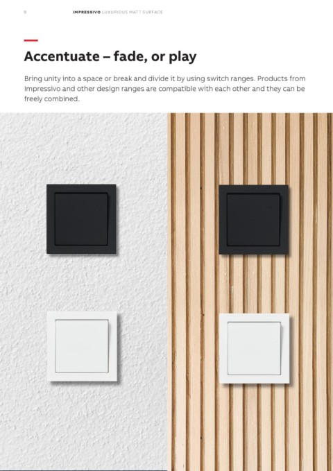 9 IMPRESSIVO LUXURIOUS MATT SURFACE — Accentuate – fade, or play Bring unity into a space or break and divide it by using switch ranges. Products from Impressivo and other design ranges are compatible with each other and they can be freely combined.