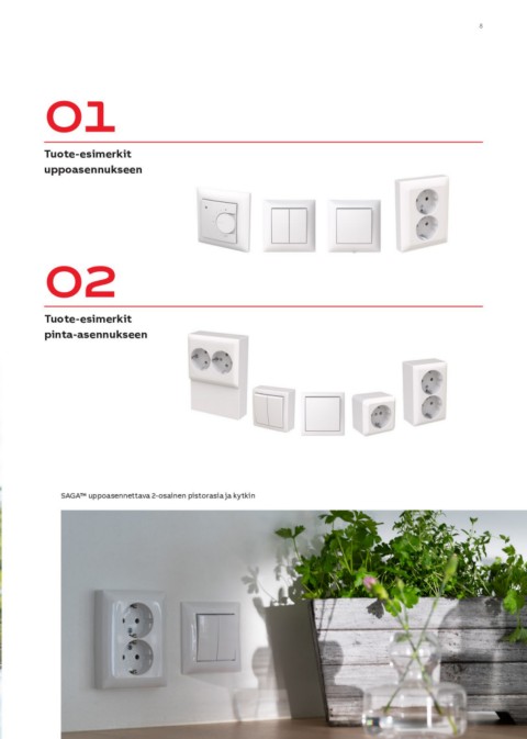 8 Tuote-esimerkit uppoasennukseen Tuote-esimerkit pinta-asennukseen SAGA™ uppoasennettava 2-osainen pistorasia ja kytkin