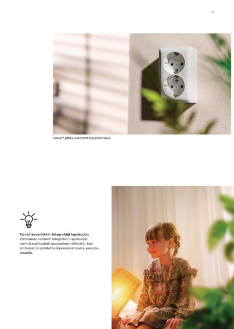 10 SAGA™ pinta-asennettava pistorasia Turvallisuusvinkki – Integroidut lapsisuojat Pistorasian runkoon integroidut lapsisuojat varmistavat kosketussuojauksen silloinkin, kun pintaosat on poistettu (kaksoispistorasia, europis- torasia).