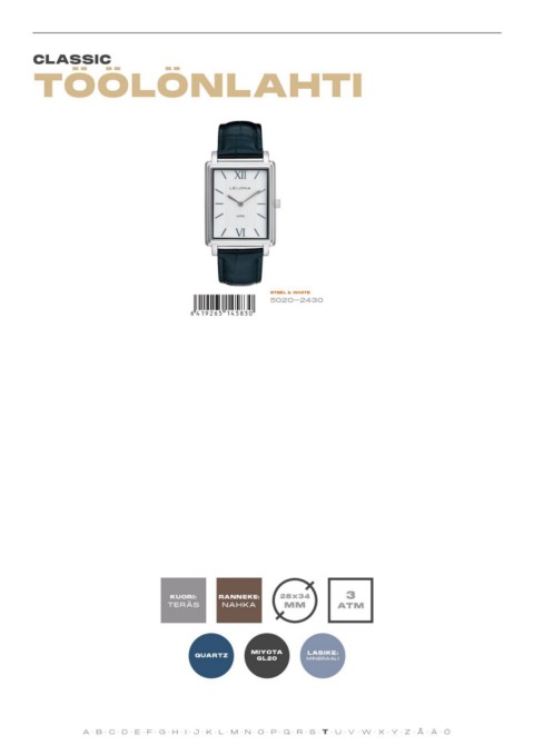 CLASSIC TÖÖLÖNLAHTI STEEL & WHITE *6419265145830* 5020-2430 109 € KUORI: RANNEKE: 28x34 3 TERÄS NAHKA MM ATM QUARTZ MIYOTA LASIKE: GL20 MINERAALI A·B·C·D·E·F·G·H·I·J·K·L·M·N·O·P·Q·R·S·T·U·V·W·X·Y·Z·Å·Ä·Ö