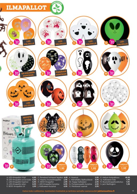 A. LED-ilmapallot 4 kpl 6,95 F. Pimeässä hohtavat lepakot 4,95 K. Haamut 2,95 P. Helium kotipakkaus 49,95