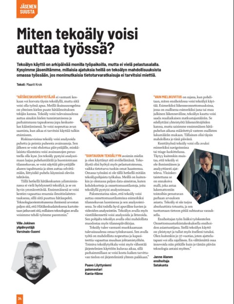 puhetta ja poimia puheesta avainsanoja. Sen tilannekuvan luomisessa ja sen analysoimi- Kenttätyössä tekoäly voisi olla avuksi