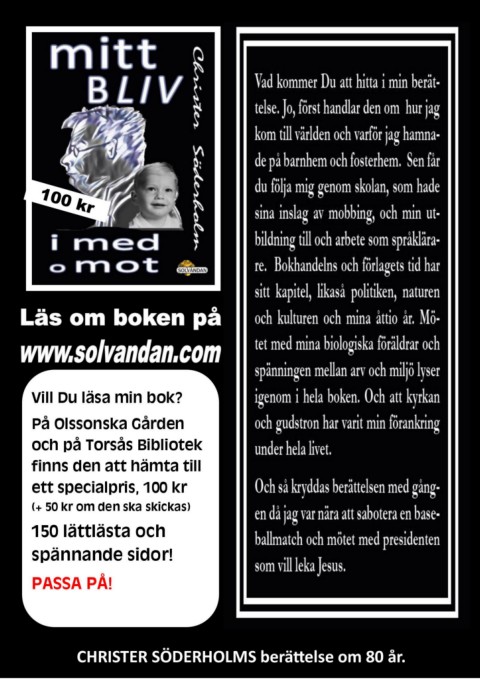 Vill Du läsa min bok? På Olssonska Gården och på Torsås Bibliotek finns den att hämta till ett specialpris, 100 kr (+ 50 kr om den ska skickas) 150 lättlästa och spännande sidor! PASSA PÅ! CHRISTER SÖDERHOLMS berättelse om 80 år.