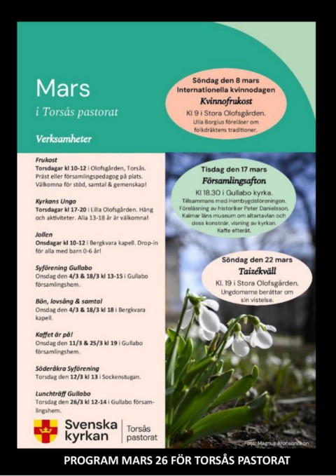 Tisdag 18 januari 11.00 Ekumenisk mässa Torsås kyrka Jimmy Andersson predikar PROGRAM MARS 26 FÖR TORSÅS PASTORAT