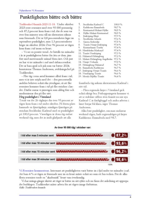 Trafikverket Hemsida 2025-11-18. Under oktober 1. Stockholm-Karlstad C 100,0 %.