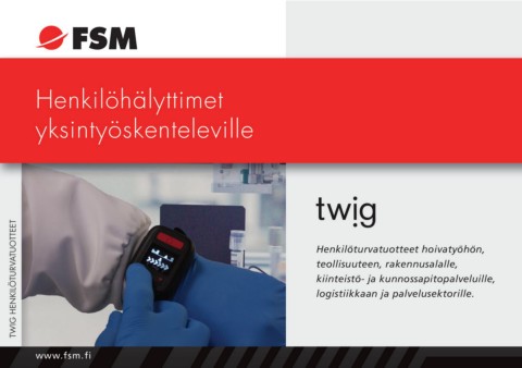 Henkilöhälyttimet yksintyöskenteleville TWIG HENKILÖTURVATUOTTEET Henkilöturvatuotteet hoivatyöhön, teollisuuteen, rakennusalalle, kiinteistö- ja kunnossapitopalveluille, logistiikkaan ja palvelusektorille. www.fsm.fi