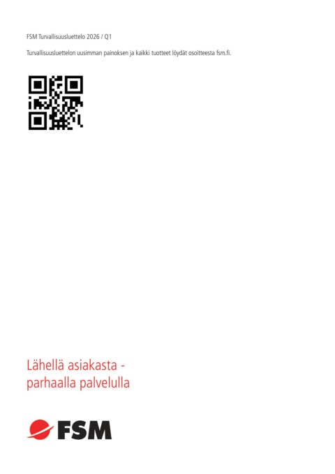 FSM Turvallisuusluettelo 2026 / Q1 Turvallisuusluettelon uusimman painoksen ja kaikki tuotteet löydät osoitteesta fsm.fi. Lähellä asiakasta - parhaalla palvelulla