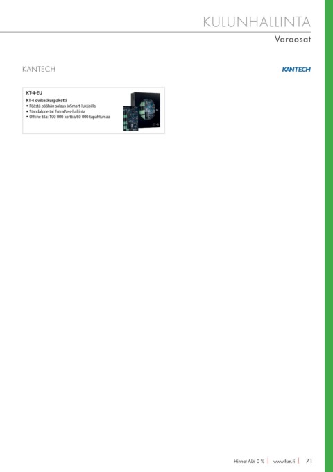 KULUNHALLINTA Varaosat KANTECH KT-4-EU KT-4 ovikeskuspaketti • Päästä päähän salaus ioSmart-lukijoilla • Standalone tai EntraPass-hallinta • Offline-tila: 100 000 korttia/60 000 tapahtumaa Hinnat ALV 0 % I www.fsm.fi I 71 71