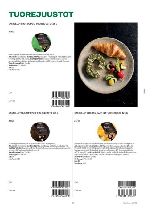 Mustapippurilla maustettu runsasrasvainen tuorejuusto. Ananas-manteli -sekoituksella maustettu runsasrasvainen tuorejuusto.