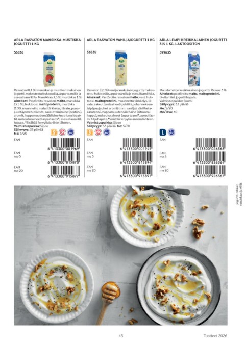 Rasvaton (0,1 %) mansikan ja mustikan makuinen Rasvaton (0,1 %) vaniljanmakuinen jogurtti, makeu Maustamaton kreikkalainen jogurtti. Rasvaa 3 %.