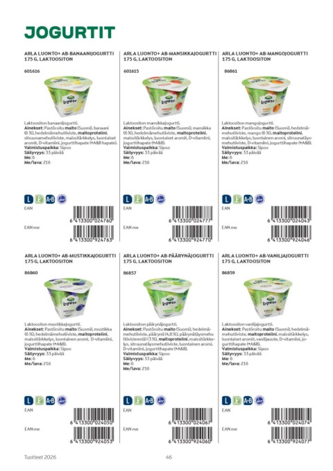 ARLA LUONTO+ AB-BANAANIJOGURTTI ARLA LUONTO+ AB-MANSIKKAJOGURTTI ARLA LUONTO+ AB-MANGOJOGURTTI