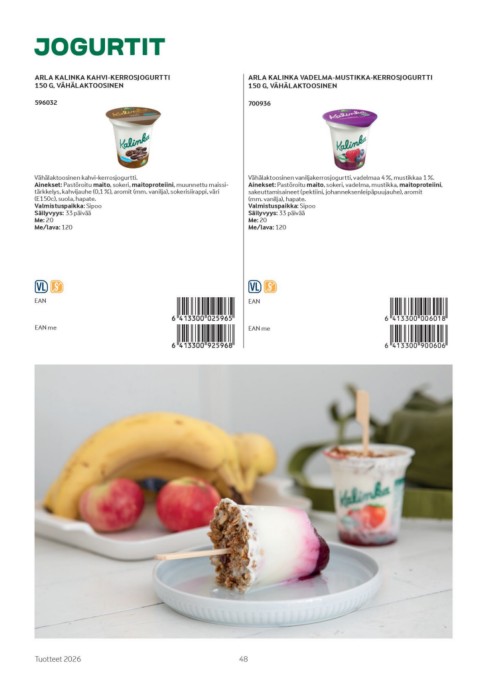 Vähälaktoosinen kahvi-kerrosjogurtti. Vähälaktoosinen vaniljakerrosjogurtti, vadelmaa 4 %, must ikkaa 1 %.