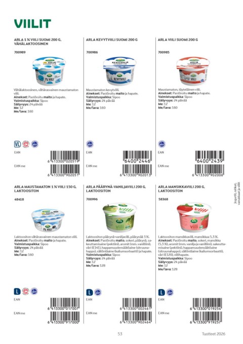 Laktoositon vähärasvainen maustamaton viili. Laktoositon päärynä-vaniljaviili, päärynää 3 %. Laktoositon mansikkaviili, mansikkaa 5,3 %.