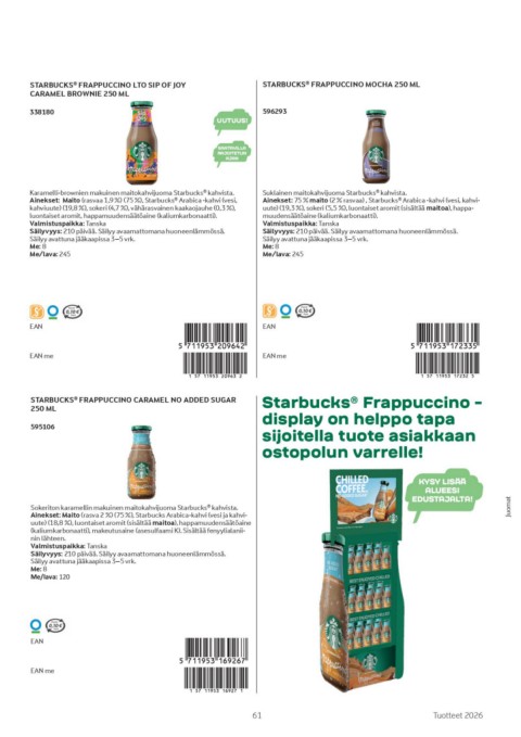Ainekset: Maito (rasvaa 1,9 %) (75 %), Starbucks® Arabica kahvi (vesi, Ainekset: 75 % maito (2 % rasvaa) , Starbucks® Arabica kahvi (vesi, kahvi
