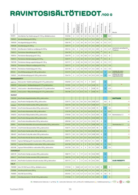 = Vähälaktoosinen (laktoosia < 1 g/100 g) = Laktoositon (laktoosia < 0,01 g/100 g) = Sisältää gluteenia • = Sisältää aspartaamia • = • = • =
