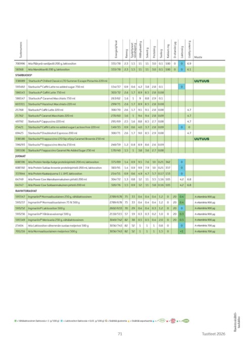 = Vähälaktoosinen (laktoosia < 1 g/100 g) = Laktoositon (laktoosia < 0,01 g/100 g) = Sisältää gluteenia • = Sisältää aspartaamia • = • = • = Ravintosisältö-