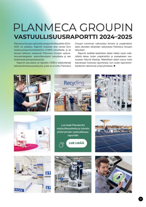 2025 on julkaistu. Raportti mukailee ensi kertaa EU:n       sekä ulkoisten tekijöiden vaikutuksia Planmeca Groupin